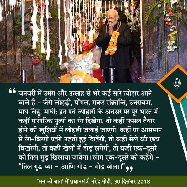 मैं आप सभी को 2019 की बहुत-बहुत शुभकामनाएँ देता हूँ और आने वाले त्योहारों का आप भरपूर आनन्द उठाएँ इसकी कामना करता हूँ | इन उत्सवों पर ली गई photos को सबके साथ share करें ताकि भारत की विविधता और भारतीय संस्कृति की सुन्दरता को हर कोई देख सके।