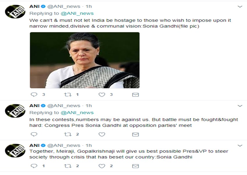 सोमवार 17 जुलाई को होने वाले राष्ट्रपति चुनाव से पहले विपक्षी दलों का हौसला बढ़ाते हुए सोनिया गांधी ने विपक्षी दलों के राष्ट्रपति और उपराष्ट्रपति उम्मीदवार की शख्सियत का हवाला दिया और कहा कि मीरा जी और गोपाल कृष्ण जी के रुप में हमलोगों को सर्वोत्तम राष्ट्रपति और उपराष्ट्रपति मिलेगा जो देश को मौजूदा खतरे से बाहर निकाल कर ले जाएगा। सोनिया ने कहा कि इन चुनावों में आंकड़े भले ही हमारे पक्ष में ना हों, लेकिन लड़ाई होगी और जबर्दस्त होगी। बता दें कि उपराष्ट्रपति पद के लिए विपक्षी दलों के उम्मीदवार गोपाल कृष्ण गांधी 18 जुलाई को नामांकन दाखिल करेंगे। जबकि बीजेपी ने उपराष्ट्रपति पद के लिए अपने कैंडिडेट के नाम का ऐलान नहीं किया है।
