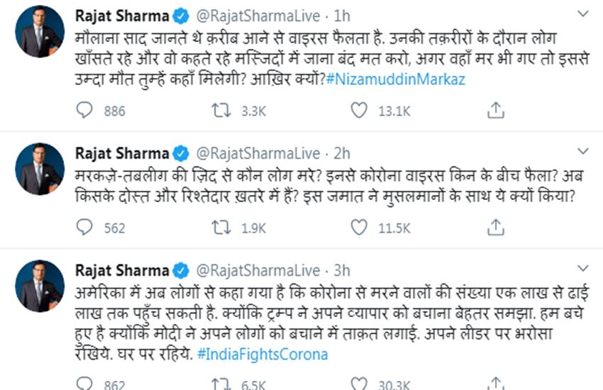 Coronavirus in India: इंडिया टीवी के एडटिर-इन-चीफ रजत शर्मा ने बुधवार (1 अप्रैल, 2020) को ट्वीट के जरिए मुस्लिम धार्मिक नेता मौलाना साद पर निशाना साधा है। उन्होंन ट्वीट कर पूछा, ‘मौलाना साद जानते थे करीब आने से वाइरस फैलता है। उनकी तकरीरों के दौरान लोग खांसते रहे और वो कहते रहे मस्जिदों में जाना बंद मत करो। अगर वहां मर भी गए तो इससे उम्दा मौत तुम्हें कहां मिलेगी? आखिर क्यों?’ मौलाना साद निजामुद्दीन मरकज में सबसे बड़े ओहदेदारों में से एक हैं।