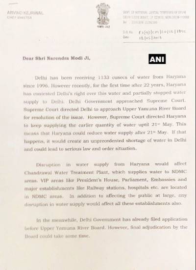 क्या लिखा है पत्र मेंः अरविंद केजरीवाल ने पीएम को भेजी चिट्ठी में लिखा है कि दिल्ली पिछले 22 सालों से हरियाणा से 1133 क्यूसेक पानी पा रहा है। चूंकि सुप्रीम कोर्ट ने हरियाणा को 21 मई तक ही पानी की निर्बाध सप्लाई का आदेश दिया था ऐसे में हरियाणा 21 मई के बाद पानी की सप्लाई में कटौती कर सकता है। ऐसे में आप हरियाणा सरकार के साथ अच्छे संबंधों के चलते उन्हें पहले की तरह ही पानी की सप्लाई जारी रखने को कहें, ताकि दिल्ली में पानी की किल्लत ना होने पाए। सीएम अरविंद केजरीवाल ने यह भी लिखा है कि हरियाणा द्वारा पानी की कटौती करने के कारण चंद्रावल वाटर ट्रीटमेंट बुरी तरह प्रभावित होगा, जिससे एनडीएमसी के इलाकों में पानी की भारी किल्लत हो सकती है, जिनमें राष्ट्रपति भवन, संसद भवन, एंबेसी और रेलवे स्टेशन, अस्पताल जैसी जगह शामिल हैं।