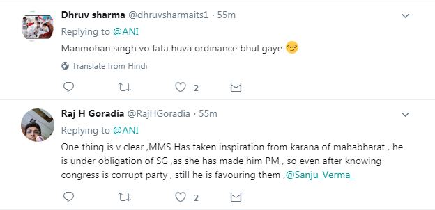 पूर्व प्रधानमंत्री डॉ मनमोहन सिंह ने कांग्रेस अध्यक्ष पद के लिए राहुल गांधी का जोरदार समर्थन किया है। सोमवार (4 दिसंबर) को जब राहुल गांधी अध्यक्ष पद के लिए पर्चा भरने पहुंचे तो उन्होंने पहले पूर्व पीएम मनमोहन सिंह से मुलाकात की। इसके बाद मनमोहन सिंह ने कहा कि राहुल गांधी कांग्रेस के डार्लिंग हैं, और वह पार्टी को उन्नति के रास्ते पर ले जाएंगे। पूर्व पीएम के इस बयान पर ट्विटर पर लोग जमकर चुटकी ले रहे हैं। कई यूजर्स ने डॉ मनमोहन सिंह को वो वाकया याद दिलाया है जब राहुल गांधी ने यूपीए सरकार के एक अध्यादेश को फाड़कर फेंक दिया था। ध्रुव शर्मा नाम के एक यूजर ने लिखा, ‘मनमोहन सिंह जी वो फटा हुआ ऑर्डिनेंस भूल गये।’ बता दें कि यूपीए-2 सरकार सजायाफ्ता सांसदों और विधायकों को बचाने के लिए एक अध्यादेश लाई थी, राहुल गांधी ने इस अध्यादेश को बकवास करार देकर फाड़ दिया था। एक यूजर ने लिखा, ‘कांग्रेस बदनाम हुई डार्लिंग तेरे लिए।’ एक यूजर ने लिखा कि अब राहुल गांधी की शादी करा दो क्योंकि उनके बच्चों को भी पार्टी अध्यक्ष बनना है।’