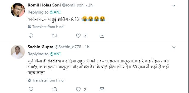 बता दें कि कांग्रेस उपाध्यक्ष राहुल गांधी ने पार्टी नेताओं और कार्यकतार्ओं के उत्साह और जोश के बीच सोमवार को पार्टी मुख्यालय में पार्टी अध्यक्ष के पद के लिए अपना नामांकन पत्र दाखिल किया। राहुल ने पूर्व प्रधानमंत्री मनमोहन सिंह और पार्टी के वरिष्ठ नेताओं कमलनाथ, मोतीलाल वोरा, शीला दीक्षित, अहमद पटेल और अशोक गहलोत की मौजूदगी में नामांकन पत्र पर हस्ताक्षर किए। उन्होंने इस मौके पर उपस्थित नेताओं के साथ बातचीत कीं और उनकी शुभकामनाएं स्वीकार की। सोशल मीडिया पर इस मसले पर जमकर टिप्पणियां की जा रही हैं। एक यूजर ने लिखा, ‘मनमोहन सिंह फिर से मैडम का लिखा हुआ स्क्रिप्ट पढ़ रहे हैं।’ एक यूजर ने लिखा है कि, ‘ जैसे आप सोनिया के डार्लिंग थे वैसे ही राहुल भी कांग्रेस के डार्लिंग होंगे।’