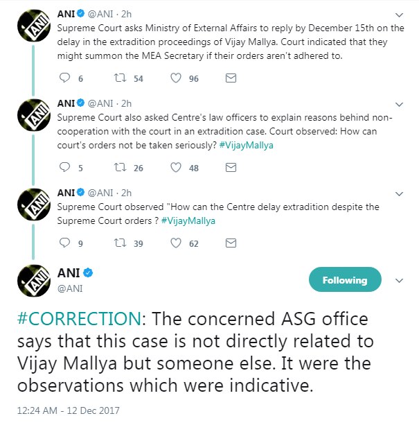 बता दें कि इससे पहले समाचार एजेंसी एएनआई ने सुप्रीम कोर्ट की इस टिप्पणी को विजय माल्या से जोड़कर दिखाया था। लेकिन बाद में एएनआई ने स्पष्टीकरण देकर कहा कि ये मामला सीधे-सीधे विजय माल्या से ना जुड़ा होकर किसी ओर से जुड़ा है। एएनआई ने कहा कि कोर्ट की टिप्पणी भी महज संकेतात्मक है।
