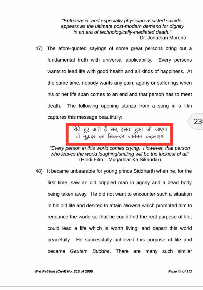 फैसले में आगे लिखा गया है कि जिंदगी नश्वर है, क्षणभंगूर है, यह एक कड़वी सच्चाई है कि कोई भी व्यक्ति, कोई भी सजीव हमेशा के लिए जिंदा नहीं रह सकता है। फैसले में महात्मा बुद्ध का भी जिक्र किया गया है। इसमें लिखा गया है कि युवा सिद्धार्थ ने जब पहली बार एक जीर्ण-शीर्ण वृद्ध व्यक्ति को देखा तो उनसे उनका दुख देखा नहीं गया और वह जीवन के सही अर्थ की खोज में निकल पड़े। सिद्धार्थ ने सत्य की खोज की और वह गौतम बुद्ध बन गये।