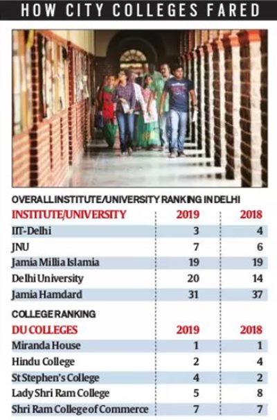 आधे डीयू के शिक्षक अनौपचारिक आधार पर नियुक्तः डीयू में स्थायी संकाय भी एक कारण है जो इसके रैंकिंग को पहले से और भी खराब किया है। डीयू को रैंकिंग में 100 में 47.87 अंक दिया गया है जो पिछले साल 52.52 अंक था। इसमें नियुक्त किए गए 50 प्रतिशत (करीब 4000) से ज्यादा शिक्षक अनौपचारिक आधार पर नियुक्त किए गए हैं। बता दें कि शिक्षक अनौपचारिक आधार पर नियुक्त के लिए डीयू के शिक्षक संघ ने विरोध भी किया था। NIRF के वेबसाइट के द्वारा यह पता चला है कि डीयू ने ‘कैपिटल एसेट्स का निर्माण’ में बहुत ही कम खर्च किया है। वहीं इसके सेमिनार / सम्मेलन / कार्यशालाओं पर खर्च भी 2016-17 में 1.06 करोड़ रुपये से गिरकर 2017-18 में 81.81 लाख रुपए हो गया है। डीयू ने कुछ भाग में अच्छा काम किया है। आंकड़ो के अनुसार ग्रैजुएशन आउटकम (100 में से 87.18, पिछले वर्ष के 85.14 के विपरीत), आउटरीच और विशिष्टता (पिछले वर्ष के 51.26 की तुलना में इस वर्ष 100 में से 55.4) और धारणा (इस वर्ष 100 में से 41.11, जैसा कि पिछले वर्ष 33.15 के विपरीत था) में अच्छी बढ़त मिली है।