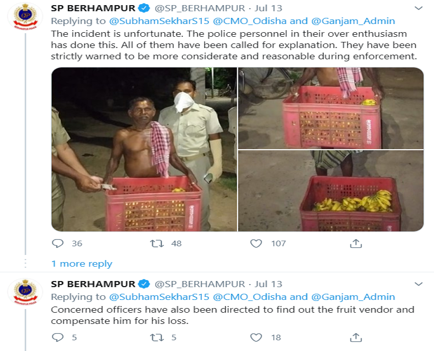 बाद में @SP_BERHAMPUR के हैंडल से जवाब दिया गया- यह घटना दुर्भाग्यपूर्ण है। पुलिस कर्मचारियों ने जो कुछ भी किया वह अत्यधिक जोश में किया। उन सभी को स्पष्टीकरण के लिए बुलाया गया है। उन्हें इसके साथ ही चेताया गया है कि वे आगे से और समझदारी बरतें। यही नहीं, अगले ट्वीट में एसपी बहरामपुर की ओर से बताया गया कि उक्त पुलिस वालों को उस फल वाले को ढूंढ कर उसके तब के हुए नुकसान की भरपाई करने के लिए भी कहा गया।