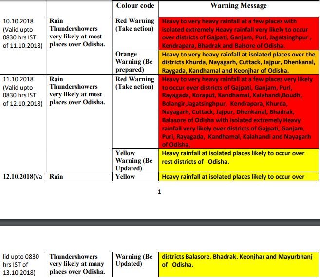 ओडिशा में भुवनेश्वर स्थिथ मौसम विभाग केंद्र की ओर से राज्य में अगले तीन दिनों तक के लिए भारी वर्षा की आशंका जताई गई है। राज्य के कुछ हिस्सों में इसी के साथ हल्की-फुल्की चक्रवाती तूफान की स्थिति भी बन सकती है।