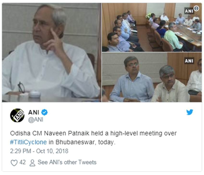 ओडिशा के मुख्यमंत्री नवीन पटनायक ने कहा कि हम तितली तूफान से बचने के लिए सभी कोशिश कर रहे हैं। उन्होंने कहा कि हम 3 लाख जलाशयों की निगरानी कर रहे हैं। आवश्यक सेवाओं और सामानों की आपूर्ति के साथ तैयार हैं। इसके अलावा लोगों से अपील की है कि किसी तरह की अफवाहों से परेशान होने की जरूरत नहीं है।