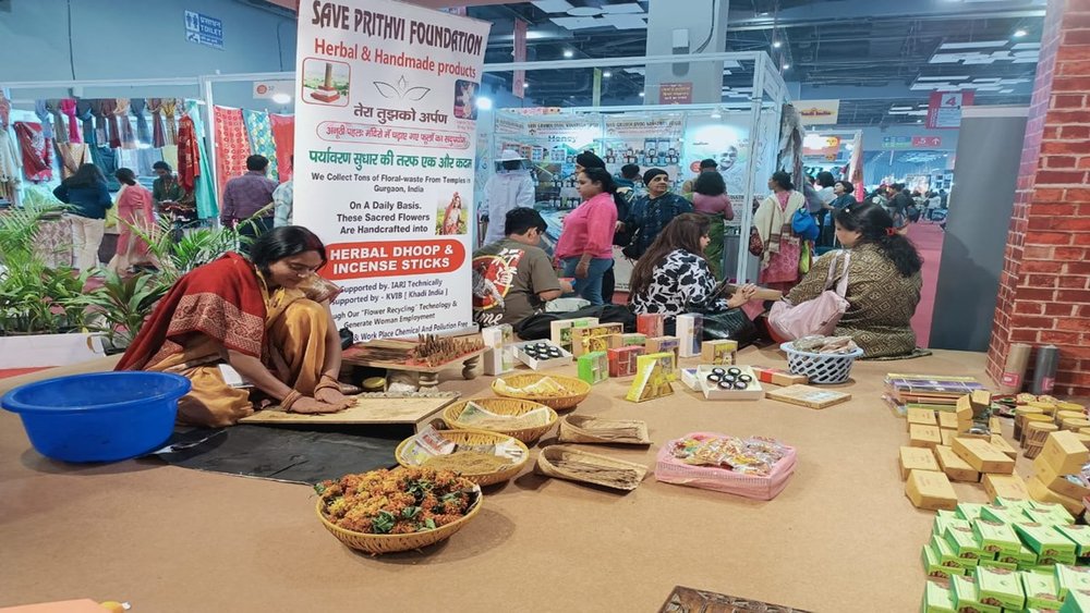 व्यापार मेले के हाल नंबर 3 में खादी पवेलियन में महात्मा गांधी की मूर्ति और विभिन्न राज्यों जैसे गुजरात, राजस्थान, उत्तर प्रदेश व बिहार के परंपरागत चरखों के साथ ही चंद्रयान का होर्डिंग सेल्फी पाइंट बन गए हैं। खादी अध्यक्ष मनोज कुमार ने बताया कि यहां आपको मंदिर के बासी फूलों का पुनर्चक्रण कर उससे बनने वाली अगरबत्ती मिल जाएगी। जिसे गुरुग्राम के करीब 25-30 मंदिरों से रोजाना दो से तीन क्विंटल फूलों को एकत्र कर सुखाकर, मुल्तानी मिट्टी मिलाकर तैयार किया जा रहा है।