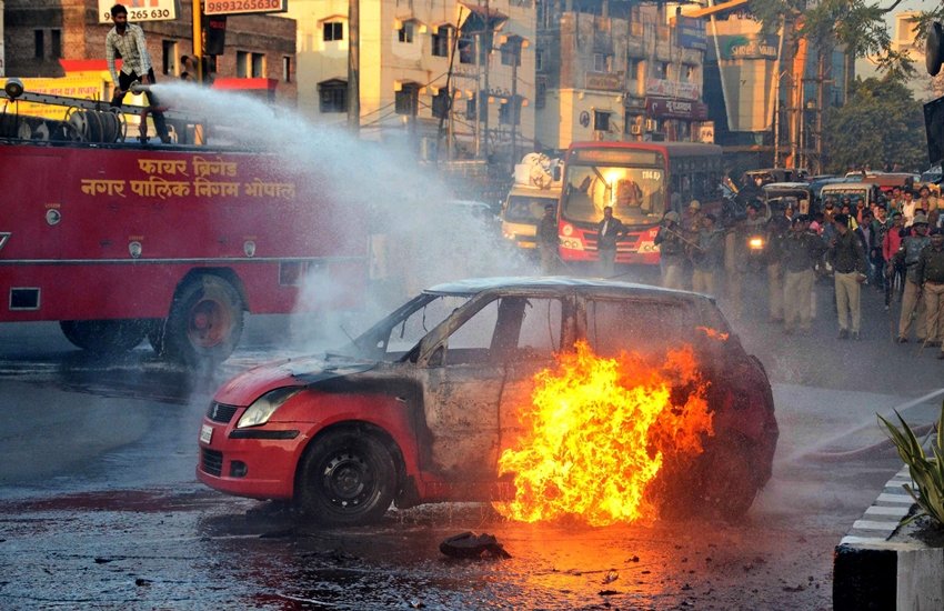 पुलिस के मुताबिक कुछ आपराधित तत्थों ने विरोध प्रदर्शन की आड़ में करणी सेना के ही एक कार्यकर्ता की मारुति स्विफ्ट कार में कार लगा दी। पुलिस ने इस घटना के संबंध नें 6 लोगों को दबोचा। पुलिस के मुताबिक प्रदर्शन कर रहे लोगों ने मध्य प्रदेश के नंबर वाली MP 04 HC 9653 गाड़ी में आग लगाई। कार मालिक मध्यमवर्गीय परिवार से बताया जा रहा है। प्रदर्शनकारियों ने वहां लगे बीजेपी नेताओं के पोस्टर भी फाड़े। पीड़ित करणी सेना का कार्यकर्ता ईडब्ल्यू एस कॉलोनी का रहने वाला है और आर्थिक रूप से कमजोर बताया जा रहा है।