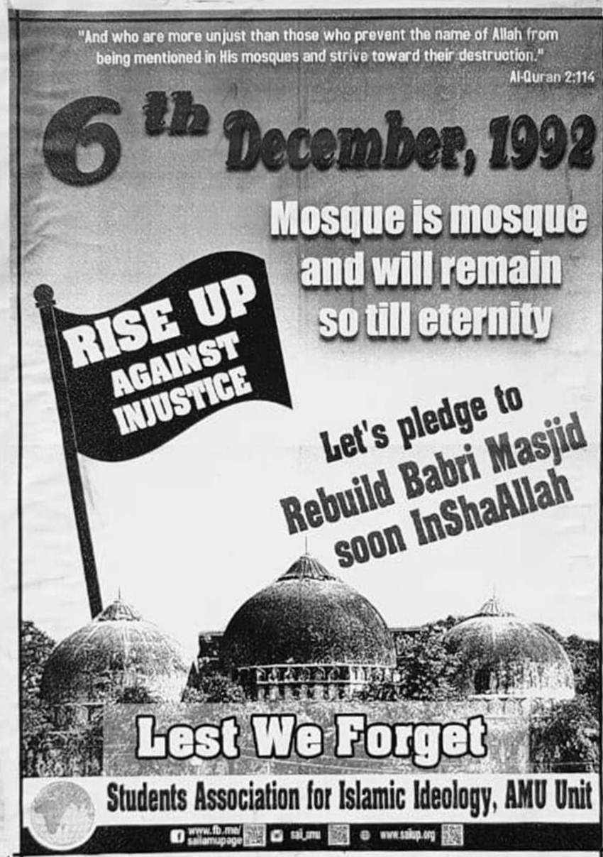 हालांकि, एएमयू के एक पीएचडी स्टूडेंट मुबाशिर ने कहा कि उन्होंने इन पोस्टरों को लगवाया ताकि ‘लोगों को बाबरी मस्जिद की याद दिलाईे जा सके और यह सुनिश्चित किया जा सके कि आने वाली पीढ़ियां इसे न भूलें।’ यह स्टूडेंट खुद को स्टूडेंट्स असोसिएशन फॉर इस्लामिक आइडियोलॉजी, एएमयू यूनिट का मीडिया इंचार्ज भी बताता है। मुबाशिर ने कहा, ‘हम अयोध्या में बाबरी मस्जिद दोबारा से बनवाने का समर्थन करते हैं। हमारा संगठन अलीगढ़ का है और इसके लखनऊ, आजमगढ़, अयोध्या और संभल में केंद्र हैं। हमारे संगठन के 300 सदस्य हैं। अलीगढ़ मुस्लिम यूनिवर्सिटी में हमारे 20 सक्रिय सदस्य हैं।’