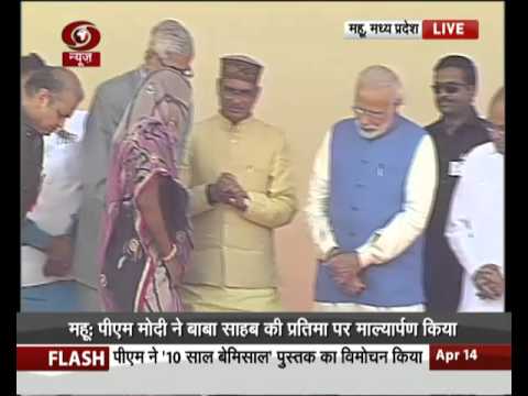 संविधान निर्माता डॉ भीमराव अंबेडकर की 125वीं सालगिरह के मौके पर पीएम नरेंद्र मोदी गुरुवार को अंबेडकर के जन्‍मस्‍थल महू पहुंचे। यहां उन्‍होंने डॉ अंबेडकर को श्रद्धांजलि दी। पीएम के साथ सीएम शिवराज सिंह चौहान भी मौजूद थे। यहां मोदी की एक रैली भी हुई। यह रैली विवादों में आ गई थी। इंदौर जिले के प्राइवेट और सरकारी इंजीनियरिंग कॉलेजों को आदेश दिया गया था कि वे रैली के लिए 100-100 स्‍टूडेंट्स भेजें। कांग्रेस ने सत्‍ताधारी बीजेपी पर निशाना साधते हुए कहा था कि मोदी का असर खत्‍म हो चुका है, इसलिए पार्टी को इस तरह के हथकंडे आजमाने पड़ रहे हैं।