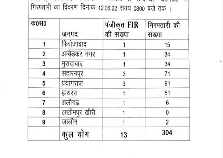 उत्तर प्रदेश के एडीजी कानून एवं व्यवस्था प्रशांत कुमार ने बताया कि प्रदेश में हुई हिंसक घटनाओं को देखते हुए उत्तर प्रदेश में 10 जून तक विरोध प्रदर्शन के मद्देनजर कुल 304 आरोपियों को गिरफ्तार किया गया। इनमें से प्रयागराज से 91 गिरफ्तारियां, सहारनपुर से 71 गिरफ्तारियां, हाथरस से 51 गिरफ्तारियां, मुरादाबाद से 34 गिरफ्तारियां, फिरोजाबाद से 15 गिरफ्तारियां और अंबेडकरनगर से 34 गिरफ्तारियां जबकि 13 लोगों पर प्राथमिकी दर्ज करवाई गई है।