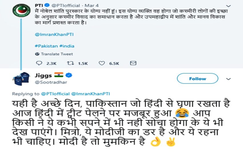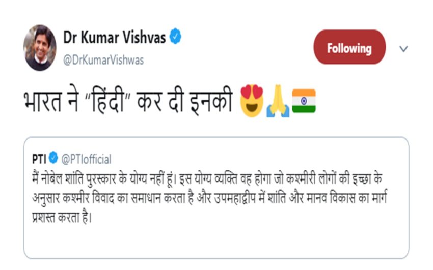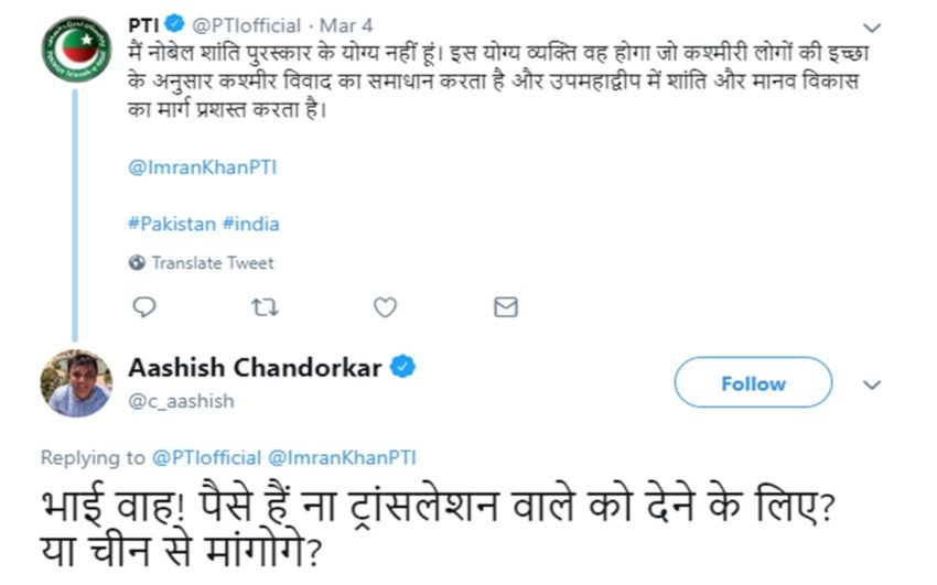पीटीआई ने यह लिखा ट्वीट में : सोमवार दोपहर (4 मार्च) को किए गए हिंदी ट्वीट में इमरान खान के हवाले से लिखा गया है, ‘‘मैं नोबेल शांति पुरस्कार के योग्य नहीं हूं। इस योग्य व्यक्ति वह होगा, जो कश्मीरी लोगों की इच्छा के अनुसार कश्मीर विवाद का समाधान करता है और उपमहाद्वीप में शांति और मानव विकास का मार्ग प्रशस्त करता है। बता दें कि हाल ही में पाकिस्तान में पीएम इमरान खान को नोबेल पुरस्कार से सम्मानित किए जाने की मांग उठ रही है। अनुमान है कि इसी वजह से यह ट्वीट किया गया है।