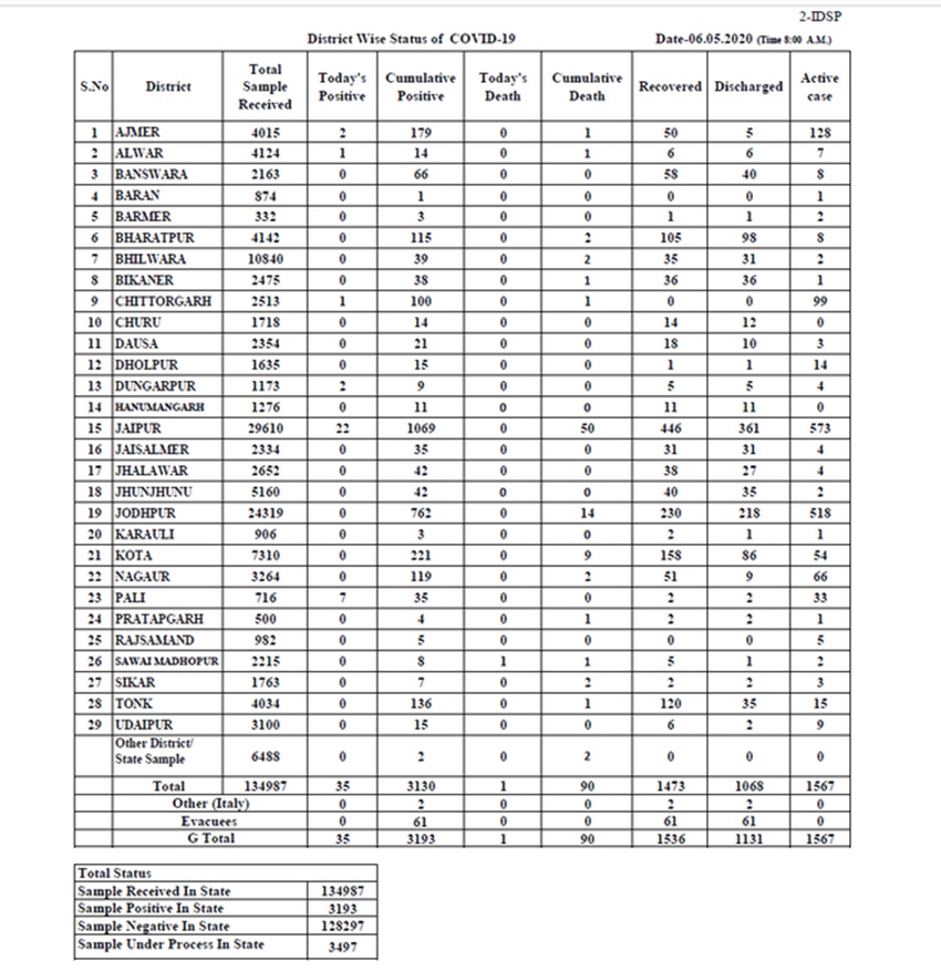 राजस्थान में आज यानी बुधवार (6 मई, 2020) को कोरोना वायरस के 35 नए मामलों की पुष्टि हुई है। इस बीच संक्रमण से एक व्यक्ति की मौत हो गई। राज्य स्वास्थ्य विभाग ने बताया कि प्रदेश में कुल संक्रमितों की संख्या अब 3193 हो गई है, जिसमें 90 लोगों की मौत हो गई। इस बीच 1536 लोगों को इलाज के बाद छुट्टी दे दी गई है और कुल 1567 एक्टिव केस हैं।