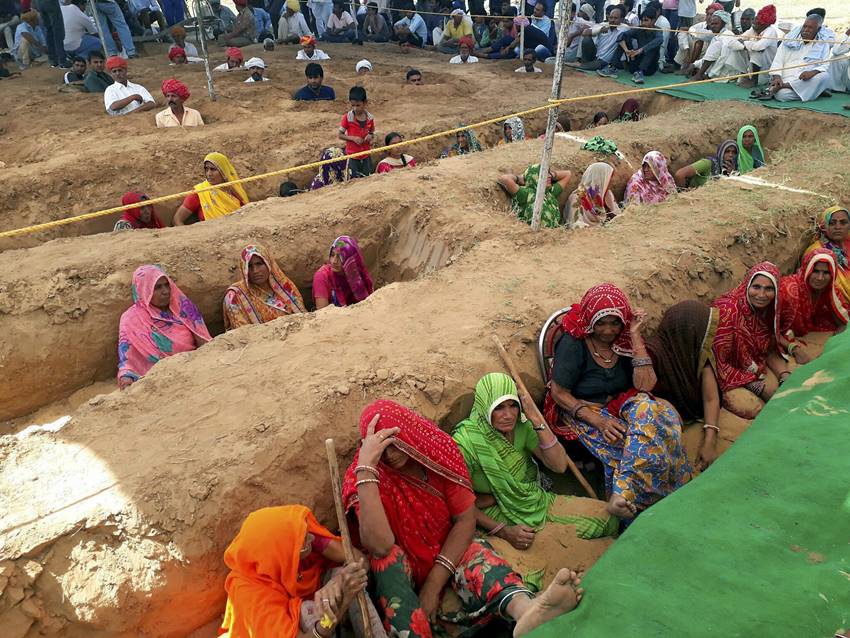 राजस्थान के जयपुर जिले के गांव नींदड़ में भूमि अधिग्रहण के खिलाफ किसान प्रदर्शन कर रहे हैं। किसानों का कहना है जयपुर डवलपमेंट अथॉरिटी उनकी जमीन हाउसिंग प्रोजेक्ट बनाने के लिए ले रही है। किसानों ने अपनी पीड़ा कई स्तर पर सुनाई, लेकिन उनकी बात कोई सुनने को तैयार नहीं है। जिसके बाद किसानों ने जमीन में गड्ढा खोदकर खुद को उसमें गाड़कर विरोध प्रदर्शन शुरू कर किया। यह योजना 1350 बीघा जमीन पर बनाए जाएगी। बताया जा रहा है कि इस योजना से करीब 18 हजार लोग प्रभावित होंगे। ये लोग रोजाना खुद को जमीन में गाड़ लेते हैं। प्रदर्शन करने वालों का कहना है कि जब तक उनकी मांग नहीं मानी जाएंगी, तब तक प्रदर्शन जारी रहेगा।