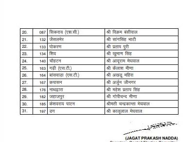बीजेपी ने राजस्थान विधानसभा चुनाव के लिए दूसरी लिस्ट जारी कर दी है। इस लिस्ट में 31 नाम हैं। आपको बता दें कि भारतीय जनता पार्टी ने पहली लिस्ट में 131 कैंडिडेट्स के नाम फाइनल किए थे। इनमें 85 पुराने कैंडिडेट हैं। इसमें 12 महिला और 32 युवा उम्मीदवारों को शामिल किया गया था। पार्टी ने 17 एससी और 19 एसटी उम्मीदवारों को टिकट दिया था। पार्टी ने 25 नए उम्मीदवारों पर भरोसा जताया है। 2013 में भाजपा ने 163 सीटें जीती थीं। राजस्थान में विधानसभा की कुल 200 सीट हैं। राजस्थान में 7 दिसंबर को वोटिंग होनी है। अधिसूचना जारी होने के साथ ही प्रदेश में नामांकन पत्र भरने का कार्य आरंभ हो जाएगा जो 19 नंवबर तक चलेगा।