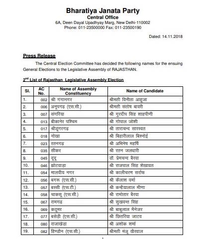 केंद्रीय मेंत्री जेपी नड्डा ने पहली लिस्ट जारी करते हुए कहा था कि सभी सीटों के लिए जिन उम्मीदवारों के नामों पर चर्चा की गई वे बैठक में मौजूद थे। अन्य प्रत्याशियों के नामों की भी जल्द घोषणा की जाएगी। कई चुनाव पूर्व सर्वेक्षणों में कांग्रेस को प्रदेश में भाजपा पर बढ़त लेते हुए दिखाया गया है हालांकि भाजपा का दावा है कि विपक्षी चुनौती का मुकाबला करने के लिए तैयार है। वसुंधरा राजे के नेतृत्व में पार्टी ने 2013 में प्रदेश की 200 विधानसभा सीटों में से 163 सीटें जीतकर कांग्रेस को सूबे में अब तक की सबसे करारी शिकस्त दी थी।