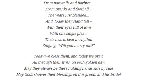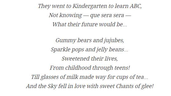 नीता अंबानी की इस कविता का टाइटल है ए ‘स्टोरी ऑफ लव।’ इस कविता में नीता अंबानी ने बचपन से लेकर अबतक के आकाश और श्लोका के सफर को याद किया है। बता दें कि आकाश और श्लोका मुंबई के बांद्रा कुर्ला कॉम्पलेक्स में स्थित नामी धीरूभाई अंबानी इंटरनेशनल स्कूल में बचपन से पढ़े हैं। अंग्रेजी में इस कविता की पहली पंक्ति ही इससे शुरू होती है कि वे केजी में एबीसी सिखने गये थे, उन्हें नहीं पता था कि उनका भविष्य कैसा होगा।
