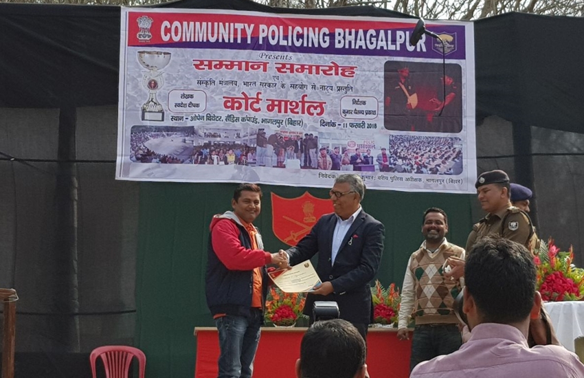 भागलपुर के सैंडिस कंपाउंड स्टेडियम में पुलिस ने एक मिसाल कायम की। कम्यूनिटि पुलिसिंग भागलपुर और संस्कृति मंत्रालय भारत सरकार की पहल पर स्टेडियम ओपेन थियेटर में तब्दील हो गया। इनकी सांस्कृतिक सौंदर्यबोध ने एक वानगी पेश की। एक तरफ सम्मान तो दूसरी तरफ कोर्ट मार्शल। दरअसल कम्यूनिटि पुलिसिंग भागलपुर द्वारा बीते दो महीने से शैक्षणिक कार्यक्रम चलाया जा रहा था। जिसमें गरीब प्रतियोगी इम्तहान की तैयारी करने वाले 500 से ज्यादा छात्रों को दारोगा बनने के गुर सिखाए गए। और यहां के टीचरों व पुलिस महकमा के ज्ञानी व माहिर लोगों ने इम्तहान में सफल होने का ज्ञान दिया। इसी के तहत आखिरी रोज एक साथ दो शानदार कार्यक्रम का आगाज किया गया। पहला छात्रों, शिक्षकों और पुलिसकर्मियों का सम्मान और दूसरा संस्कृति मंत्रालय भारत सरकार की ओर से नाटय संस्था आलय ने स्वदेश दीपक लिखित नाटक कोर्ट मार्शल का मंचन किया।