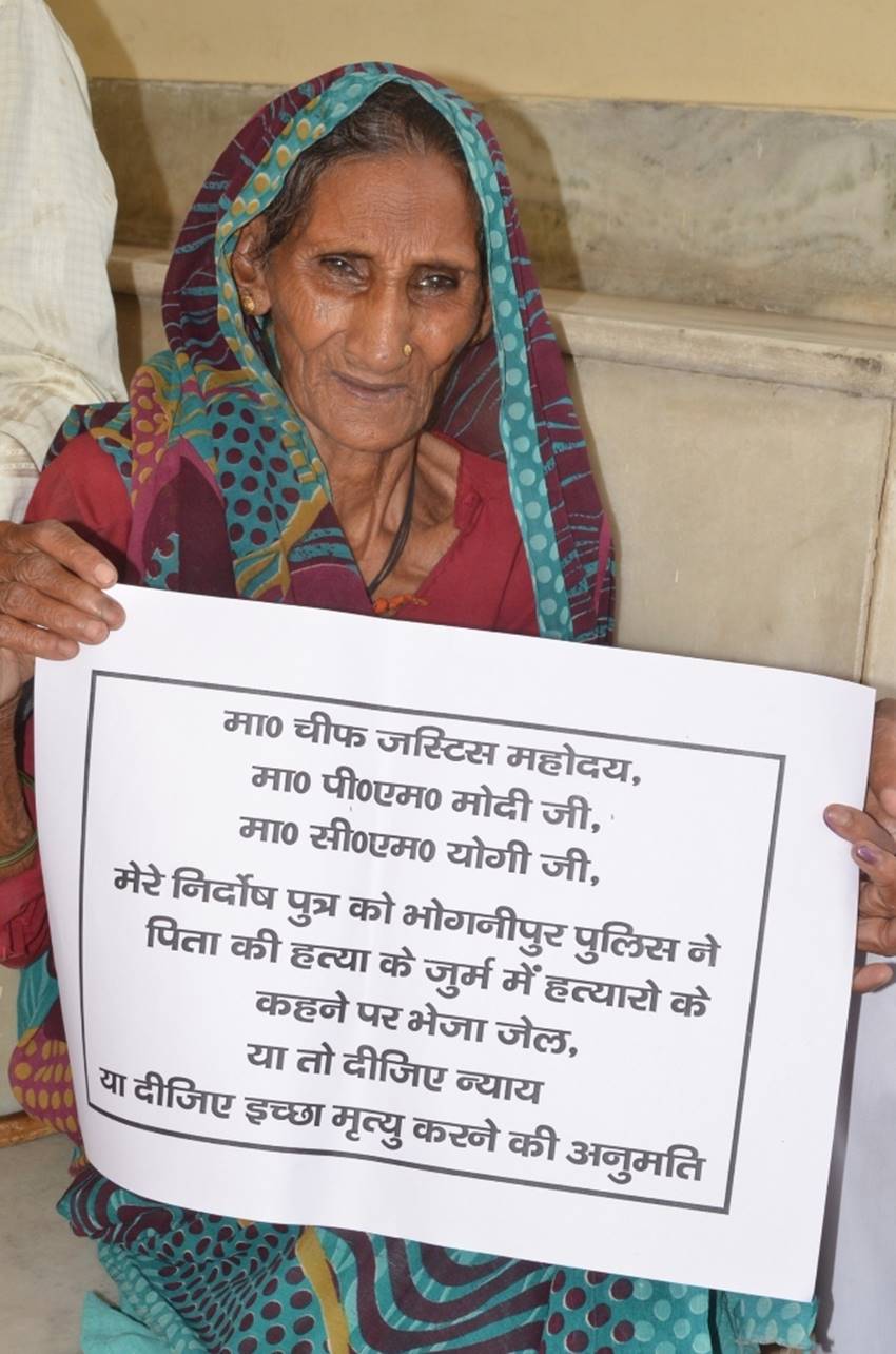 उत्तर प्रदेश की एक घटना में पिता की हत्या के आरोप में पुत्र को ही हत्यारा बना दिया गया। जब कोई सुनवाई नहीं हुई तो 80 वर्षीय वृद्ध मां कानपुर मण्डलायुक्त कार्यालय में धरना देकर बैठ गयी। वृद्धा का कहना है कि या तो उसे न्याय दिया जाये या फिर इच्छा मृत्यु की इजाजत। मिली जानकारी के अनुशार कानपुर देहात के थाना भोगनीपुर,ग्राम सुजगवां की रहने वाली 80 वर्षीय वृद्ध राम प्यारी पत्नि स्व0 श्रीराम ने मण्डलायुक्त कार्यालय कानपुर में धरना देते समय बताया कि उनके पति की हत्या नृशंष तरीके से कर दी गयी थी, जिसमें उनके पुत्र वीर सिंह ने गांव के ही श्याम बिहारी, राम बिहारी पुत्र रामकेश के खिलाफ थाना भोगनीपुर में मुकदमा दर्ज कराया था। पति की हत्या होते हुए कई लोगो ने देखा था, बावजूद इसके भोगनीपुर पुलिस ने आरोपियों को गिरफ्तार नहीं किया।