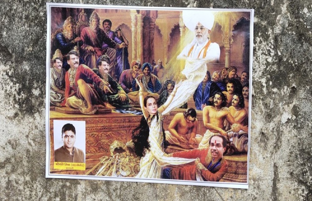 पोस्टर में उद्धव ठाकरे की शिवसेना को कौरवों की सेना के रूप में दर्शाया गया है। वहीं कांग्रेस अध्यक्ष सोनिया गांधी धृतराष्ट्र की तरह चुप्पी साधे हुए पोस्टर में नजर आ रही हैं। प्रधानमंत्री नरेंद्र मोदी को कंगना की रक्षा करते हुए भगवान श्रीकृष्ण के रूप में दर्शाया है।