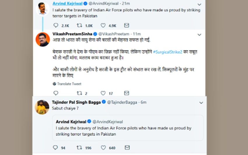 केजरीवाल पर भी कसा तंज, लिखा- सबूत चाहिए: एयर स्ट्राइक पर अरविंद केजरीवाल ने ट्वीट करते हुए लिखा- एयर फोर्स के साहस को हमारा सलाम, जिन्होंने आतंकी संगठन के ठिकाने पर हमला कर हमें गर्व महसूस किया। केजरीवाल के इस ट्वीट पर भाजपा दिल्ली प्रवक्ता तजिंदर सिंह पाल बग्गा ने रिट्वीट करते हुए लिखा- सबूत चाहिए ? तजिंदर के साथ ही भाजपा नेता विकास प्रीतम सिन्हा ने भी केजरीवाल को ट्वीट करते हुए लिखा- आज तो भारत की वायु सेना की बरसों की मेहनत सफल हो गई, बेशक सरजी ने देश के पीएम का जिक्र नहीं किया, लेकिन उन्होंने #SurgicalStrike2 का सबूत भी तो नहीं मांगा, मतलब काम बराबर हुआ है। और बाकी लोगों से अनुरोध है सरजी के इस ट्वीट को संभाल कर रख लें, सिक्यूलरों के मुंह पर मारने के लिए।
