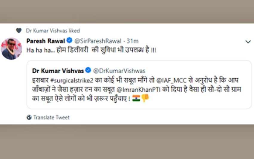 कुमार विश्वास के ट्वीट को मिला परेश रावल का साथ: सर्जिकल स्ट्राइक 2 पर कुमार विश्वास ने ट्वीट किया- कई दिनों से बालाकोट वाले भारतीय टमाटरों के लिए रो-पीट रहे थे, भारतीय वायुसेना ने रात हज़ार टन की पहली खेप जैश के कंट्रोल रूम को दे दी है ! अमन का सफ़ेद रंग तो आपको समझ नहीं आता, सो इमरान खान (पाकिस्तान के मुख्यमंत्री) उम्मीद है कि ये लाल रंग पसंद आया होगा ! जितना माँगोगे उतना टमाटर भेजेगें। वादा है। वहीं परेश रावल ने भी रिट्वीट करते हुए लिखा- हा… हा.. हा.. होम डिलीवरी की सुविधा भी उपलब्ध है !!!