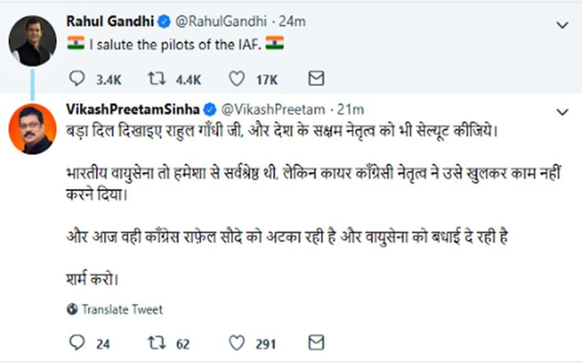 राहुल गांधी पर भाजपा नेता का वार: कांग्रेस अध्यक्ष राहुल गांधी ने इस एयर स्ट्राइक के बाद ट्वीट किया और लिखा -भारतीय वायुसेना के पायलटों को मेरा सलाम। वहीं इस पर भाजपा नेता विकास प्रीतम सिन्हा ने रिट्वीट करते हुए लिखा- बड़ा दिल दिखाइए राहुल गाँधी जी, और देश के सक्षम नेतृत्व को भी सेल्यूट कीजिए। भारतीय वायुसेना तो हमेशा से सर्वश्रेष्ठ थी, लेकिन कायर कांग्रेसी नेतृत्व ने उसे खुलकर काम नहीं करने दिया। और आज वही काँग्रेस राफ़ेल सौदे को अटका रही है और वायुसेना को बधाई दे रही है शर्म करो।