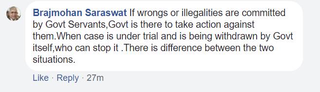 महेश की पोस्ट पर हरिहर पांडेय ने लिखा-गुण-दोष के आधार पर अभियोग का न्यायिक विचारण ही कराया जाना विधिक दृष्टि से उचित है, न कि अभियोग की वापसी का आदेश पारित करना। सुभाष चंदर ने लिखा-यह अच्छा नहीं हुआ, इसकी गूंज दूर तक जाएगी। परवेज आलम ने लिखा-योगी की मेहनत रंग लाई, अपने ऊपर के अपराध के आरोपों के साथ अपने मित्रों के अपराध भी हटा रहे, यही तो रामराज है।