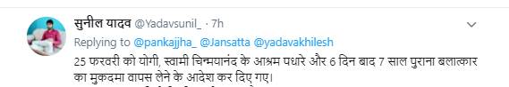 योगी आदित्यनाथ सरकार की ओर से पूर्व केंद्रीय गृहराज्य मंत्री स्वामी चिन्मयानंद पर दर्ज दुष्कर्म का केस वापस लेने की खबर सोशल मीडिया पर आग की तरह फैली। सोशल मीडिया यूजर्स ने इस पर तमाम तरह की प्रतिक्रिया जतानी शुरू की और सरकार के फैसले पर सवाल उठाए। वहीं स्वामी चिन्मयानंद के समर्थकों ने केस को साजिश बताते हुए फैसले पर खुशी भी जताई। वहीं कुछ यूजर्स ने कहा कि अब स्वामी चिन्मयानंद को भी मंत्री बना दो, खुद जज बन जाओ। जनसत्ता डॉट कॉम ने सबसे पहले केस हटाने से जुड़ी खबर पाठकों तक पहुंचाई थी। सोशल मीडिया पर इस खबर के बाद आई कुछ चुनिंदा प्रतिक्रियाओं को हम यहां दे रहे हैं।