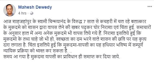 रिटायर्ड आईपीएस अफसर महेश चंद्र द्विवेदी ने इस मुद्दे पर कुछ यूं फेसबुक पर लिखा,”आज शाहजहांपुर के स्वामी चिन्मयानंद के विरुद्ध सात साल से कचहरी में चल रहे बलात्कार के मुकदमे को शासन द्वारा वापस लेने की खबर पढ़कर घोर निराशा एवं चिंता हुई। समाचारों के अनुसार हाल में अन्य अनेक मुकदमे भी वापस लिये गये हैं। निराशा इसलिये हुई कि मुकदमो के तथ्य चाहे जो भी हो, स्वच्छता का दम भरने वाले शासन की छवि पर यह कृत्य दाग़ लगाता है। चिंता इसलिये हुई कि मुकदमा-वापसी का यह हथियार भविष्य में सम्पूर्ण न्यायिक प्रक्रिया को ध्वस्त कर सकता है. ..