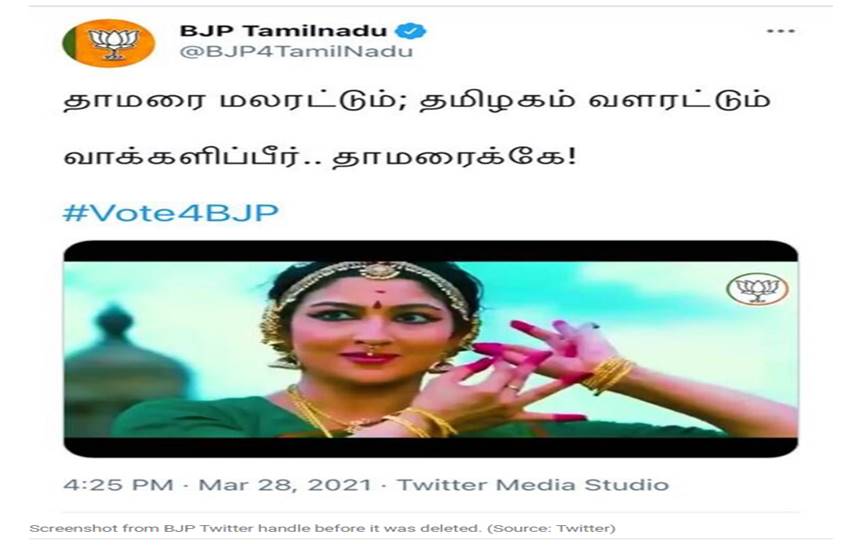 तमिलनाडु में विधानसभा चुनाव से पहले भारतीय जनता पार्टी की राज्य इकाई ने अपने ट्वीटर पेज पर “लेट लोटस ब्लूम, लेट द तमिलनाडु ग्रो” शीर्षक से एक वीडियो साझा किया था। इस वीडियो के लेकर सोशल मीडिया पर भाजपा को जमकर ट्रोल किया गया। इस वीडियो में शिवगंगा से कांग्रेस सांसद कार्ति चिदंबरम की पत्नी डॉ. श्रीनिधि चिदंबरम की फुटेज का इस्तेमाल किया गया है। इस वीडियो को 28 मार्च जारी किया गया था।