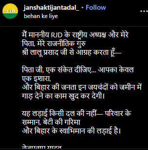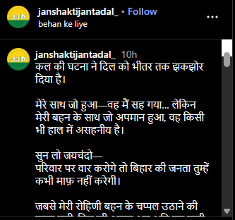 दरअसल, इंस्टाग्राम पर जनशक्ति जनता दल के जरिये एक पोस्ट शेयर किया गया हैं। उस पोस्ट में लालू यादव के बड़े बेटे ने कहा, “कल की घटना ने दिल को भीतर तक झकझोर दिया है। मेरे साथ जो हुआ, वह मैं सह गया, लेकिन मेरी बहन के साथ जो अपमान हुआ, वह किसी भी हाल में असहनीय है। सुन लो जयचंदों, परिवार पर वार करोगे तो बिहार की जनता तुम्हें कभी माफ नहीं करेगी।”