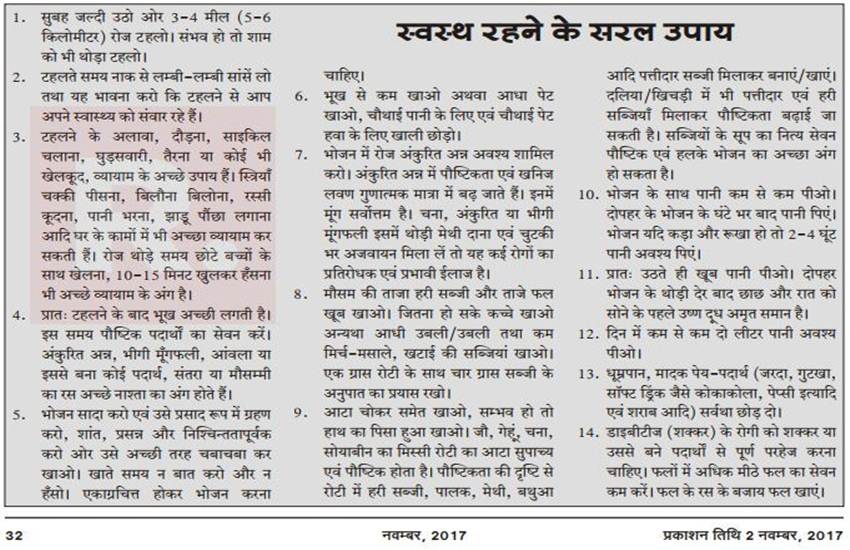 लेख में लिखा है, ‘स्वस्थ रहना है तो सुबह-सुबह टहलना जरूरी है। टहलने के अलावा दौड़ना, साइकिल चलाना, घुड़सवारी, तैरना या कोई भी खेलकूद, व्यायाम के अच्छे उपाय हैं। स्त्रियां चक्की पीसना, बिलौना बिलोनो, रस्सी कूदना, पानी भरना, झाड़ू पौंछा लगाना आदि घर के कामों में भी अच्छा व्यायाम कर सकती हैं। रोज थोड़े समय छोटे बच्चों के साथ खेलना, 10-15 मिनट खुलकर हंसना भी अच्छा व्यायाम होता है।’ इस लेख के तहत फिट रहने के लिए करीब 14 इंस्ट्रक्शन्स दिए गए हैं।