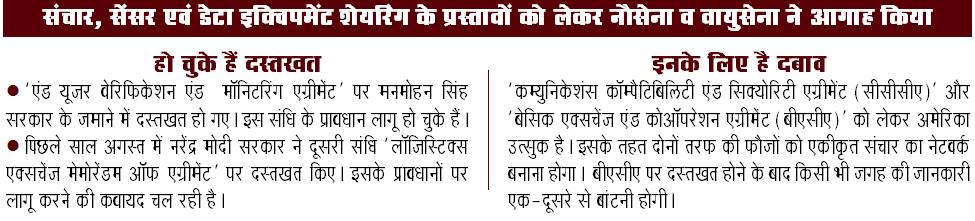 डोनाल्ड ट्रंप सरकार ने दलील दी है कि बंगाल की खाड़ी और अरब सागर में चीन का दखल बढ़ रहा है। चीन ने पाकिस्तान और बांग्लादेश में दखल बढ़ाया है। ऐसे में हिंद महासागर में चीनी पनडुब्बियों पर नजर रखने के लिए दोनों संधियां जरूरी हैं। इस बारे में अमेरिका की प्रशांत महासागरीय कमान के प्रमुख एडमिरल हैरिस की रिपोर्ट भारत सरकार को भेजी गई है। इसमें पनडुब्बी रोधी भारत के विमान पी8आइ में उपकरण बदलकर अमेरिकी पी8ए की तरह बनाने का प्रस्ताव है, ताकि संचार और डेटा शेयरिंग की जा सके।