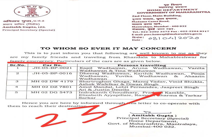 महाराष्ट्र सरकार ने वाधवा बंधुओं को लॉकडाउन के दौरान मुंबई से बाहर जाने के लिए पास जारी करने वाले वरिष्ठ आईपीएस अफसर को अनिवार्य छुट्टी पर भेज दिया। महाराष्ट्र के गृह मंत्री अनिल देशमुख ने बताया कि मुख्यमंत्री उद्धव ठाकरे के साथ चर्चा के बाद विशेष मुख्य सचिव अमिताभ गुप्ता को तत्काल छुट्टी पर भेज दिया गया है। उनके खिलाफ जांच बिठाई जाएगी और इसी के आधार पर कार्रवाई होगी।