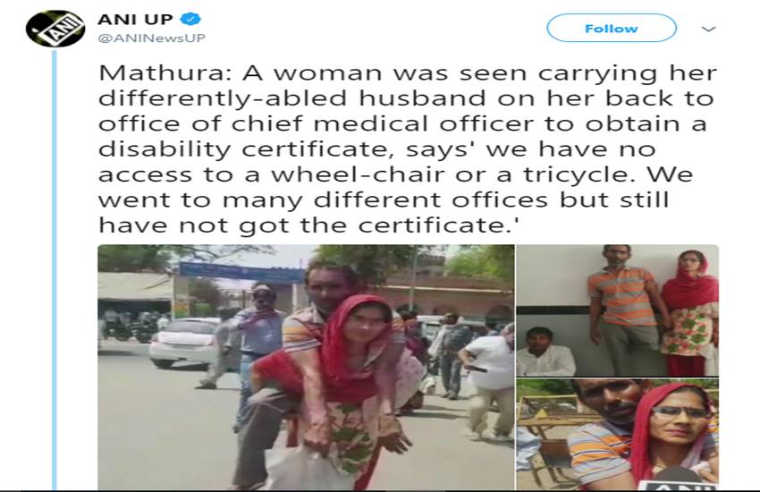 उत्तर प्रदेश के सरकारी कार्यालयों में सरकारी बाबू किस तरह से अपना काम कर रहे हैं इसकी एक बानगी मंगलवार (03-04-2018) को देखने को मिली है। मंगलवार को जो तस्वीर राज्य के मथुरा जिले से सामने आई है उसने राज्य में सरकारी बाबुओं के कामकाज के तरीके की पोल खोल दी है। यहां एक महिला अपने दिव्यांग पति को कंधे पर लेकर घंटों सरकारी दफ्तरों के चक्कर काटती रही। इस महिला का नाम बबीता बताया जा रहा है। बबीता का कहना है कि उसे अपने दिव्यांग पति के लिए व्हीलचेयर कही नहीं मिला इसलिए मजबूरी में उसे अपने पति को अपनी पीठ पर उठाकर इधर-उधर भटकना पड़ा।