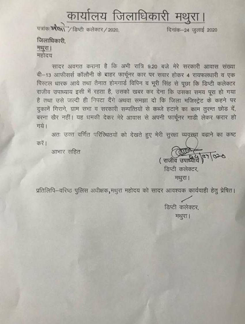 उत्तर प्रदेश में अपराधियों के हौसले किस कदर बुलंद हैं इसका अंदाजा इस बात से लगाया जा सकता है कि अपराधियों ने मथुरा के एसडीएम के घर जाकर उन्हें देख लेने की धमकी दी है। एसडीएम राजीव उपाध्याय ने डीएम और एसपी को पत्र लिखकर घटना की जानकारी दी है और सुरक्षा की गुहार लगाई है।उपाध्याय के मुताबिक रात्रि 9.20 के करीब उनके सरकारी आवास बी-13 ऑफिसर्स कॉलोनी के बाहर एक एसयूवी में चार रायफधारी और एक पिस्टलधारी आए और उनके घर पर तैनात गार्ड को धमकाया।