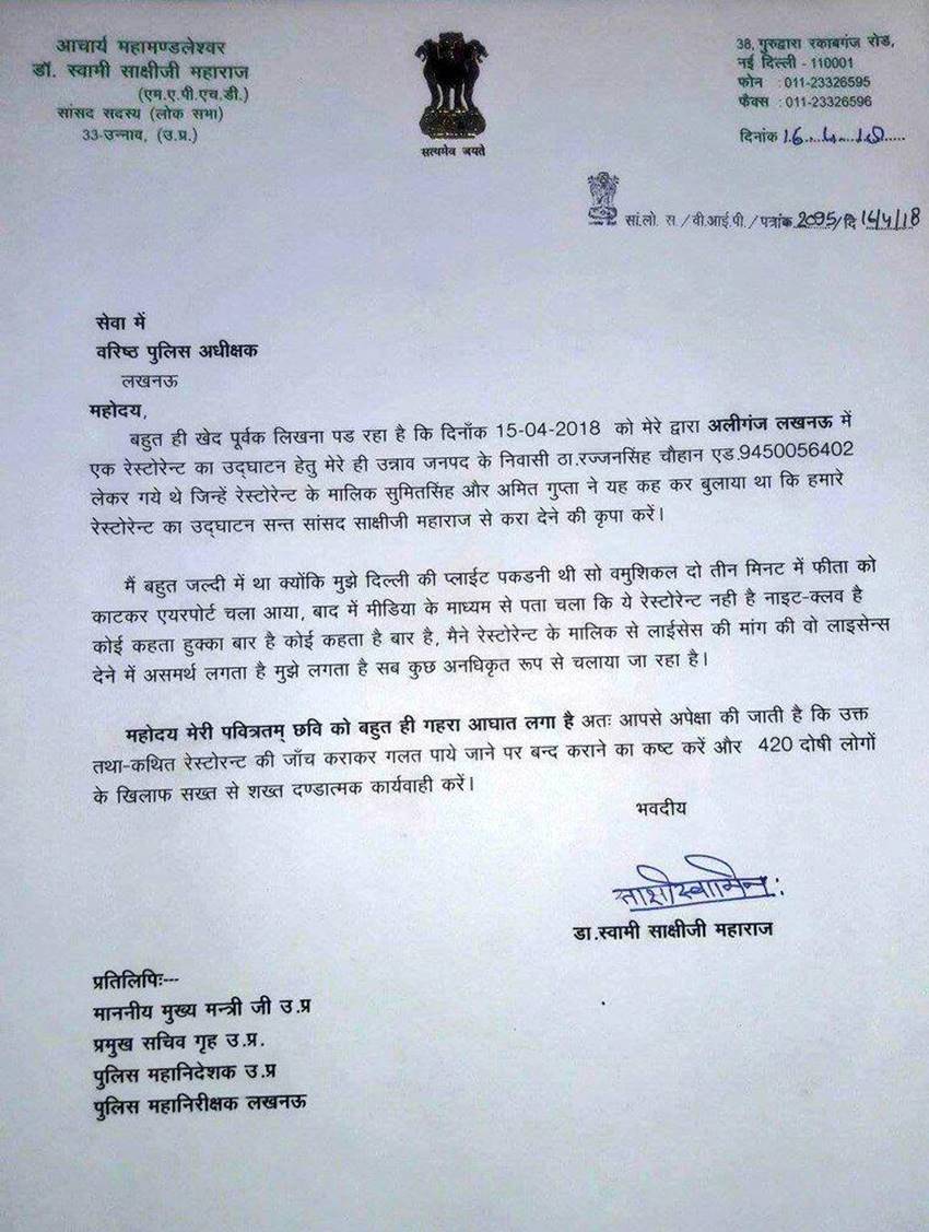 अपनी चिट्ठी में सांसद ने कहा है, “महोदय मेरी पवित्रतम छवि को बहुत ही गहरा आघात लगा है।” सांसद ने मांग की है कि इस रेस्तरां की जांच कराई जाए और अगर कुछ गलत पाया जाता है तो न केवल इसे बंद कराया जाए, बल्कि दोषी लोगों के खिलाफ सख्त से सख्त कार्रवाई की जाए।” साक्षी महाराज ने इस शिकायत की एक कॉपी सीएम योगी आदित्यनाथ के अलावा राज्य के शीर्ष अधिकारियों को भी भेजी है।