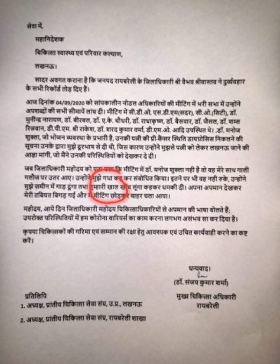 उत्तर प्रदेश के रायबरेली में जिलाधिकारी द्वारा मुख्य चिकित्सा अधिकारी का अपमान करने का मामला सामने आया है। दरअसल नोडल अधिकारियों की एक बैठक में डीएम ने सीएमओ को कथित तौर पर ‘गधा’ कहा और ‘खाल खींचकर जमीन में गाड़ देने’ की बात कही। मुख्य चिकित्सा अधिकारी ने पत्र लिखकर इसकी शिकायत महानिदेशक, चिकित्सा स्वास्थ्य एवं परिवार कल्याण, से की है और उचित कार्रवाई की मांग की है।