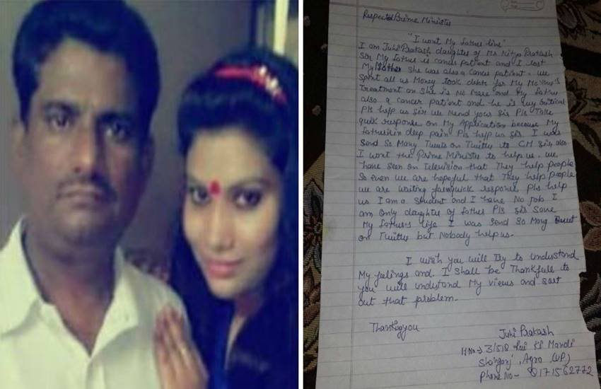 आगरा की रहने वाली एक लड़की ने अपने पिता के इलाज के लिए प्रधानमंत्री नरेंद्र मोदी और राज्य के मुख्यमंत्री अखिलेश यादव से मदद की गुहार लगाई है। 25 वर्षीय जूही प्रकाश ने ट्वीट कर कहा कि वो अपने कैंसर पीड़ित पिता को घर पर अकेला छोड़कर बैंक-एटीएम की लंबी कतारों में खड़ी नहीं हो सकती है। लड़की के पिता नित्या प्रकाश को मुंह का कैंसर है। उसने बताया कि पिछले तीन महीने से वो लोग वित्तीय संकट से जूझ रहे हैं और अब नोटबंदी के बाद से बैंकों और एटीएम में लंबी-लंबी लाइनें लगी है, जिसके चलते उनके लिए पैसे निकालकर दवा खरीदना मुमकिन नहीं हो पा रहा है।