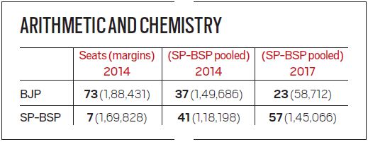 हालांकि अगर 2017 के विधानसभा चुनाव में एसपी-बीएसपी को मिले वोटों को अगर हर लोकसभा सीट में जोड़ दिया जाए तो बीजेपी के लिए अगले लोकसभा चुनाव में मुश्किलें खड़ी हो जाती है। आंकड़ों के मुताबिक अगर एसपी और बीएसपी के वोटों को जोड़ दिया जाए तो 57 लोकसभा सीटों पर इस गठबंधन को औसतन एक लाख 45 हजार वोटों की बढ़त हासिल हो जाती है। जबकि 23 सीटों पर बीजेपी की औसत बढ़त मात्र 58 हजार वोट है। इधर 2014 में बीजेपी जिन 73 लोकसभा सीटों पर चुनाव जीती थी वहां पार्टी की औसत बढ़त 1 लाख 88 हजार वोट थे। आंकड़ों का गणित बताता है कि अगर बीएसपी-एपी के वोट को जोड़ दिया जाए तो बीजेपी जिन 23 सीटों पर आगे बताई जा रही है उनमें से महज चार सीटों, वाराणसी, मथुरा, गाजियाबाद और गौतमबुद्धनगर पर ही बीजेपी जीत का अंतर एक लाख वोटों से अधिक ले जा सकेगी। बता दें कि ये आंकड़े 2017 के विधानसभा वोट से लिये गये हैं। 2017 के विधानसभा में एसपी और कांग्रेस ने साथ चुनाव लड़ा था, इसलिए यह आकलन करते समय जिन सीटों पर समाजवादी पार्टी ने अपने उम्मीदवार खड़े नहीं किये थे वहां पर कांग्रेस को मिले वोटों को एसपी का वोट माना गया है।