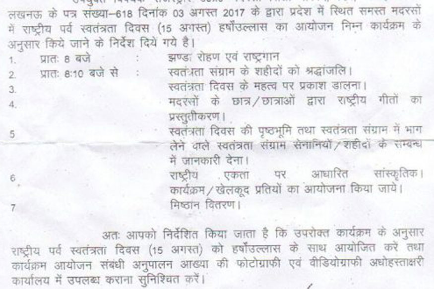उत्तर प्रदेश की सरकार ने 15 अगस्त को प्रदेश के सबी मदरसों की वीडियोग्राफी करने के आदेश दिये हैं। योगी आदित्य नाथ ने ये सुनिश्चित करने का फैसला किया है कि 15 अगस्त को हर हाल में मदरसों में शहीदों को श्रद्धांजलि दी जाए और सांस्कृतिक कार्यक्रमों को संपन्न किया जाए। दरअसल उत्तर प्रदेश मदरसा परिषद बोर्ड की ओर से 3 अगस्त को जिला अल्पसंख्यक अधिकारी को एक पत्र भेज कर निर्देश दिया गया है कि स्वतंत्रता दिवस पर सुबह आठ बजे झंडारोहण एवं राष्ट्रगान होगा। सुबह आठ बजकर 10 मिनट पर अमर शहीदों को श्रद्धांजलि दी जाएगी। इन सभी कार्यक्रमों की फोटोग्राफी और वीडियोग्राफी कराकर जिले के अल्पसंख्यक अधिकारी को सौंपने का भी निर्देश दिया गया है। प्रदेश के इतिहास में ऐसा पहली बार होने जा रहा है जब इस तरह से वीडियोग्राफी कर मदरसों पर नजर रखी जाएगी। आपको बता दें कि इस वक्त उत्तर प्रदेश में लगभग 8000 मदरसे हैं जो प्रदेश मदरसा परिषद के तहत आते हैं। इनमें से 560 मदरसे ऐसे हैं जो पूरी तरह से सराकर से मिले वित्तीय सहायता पर चलते हैं।