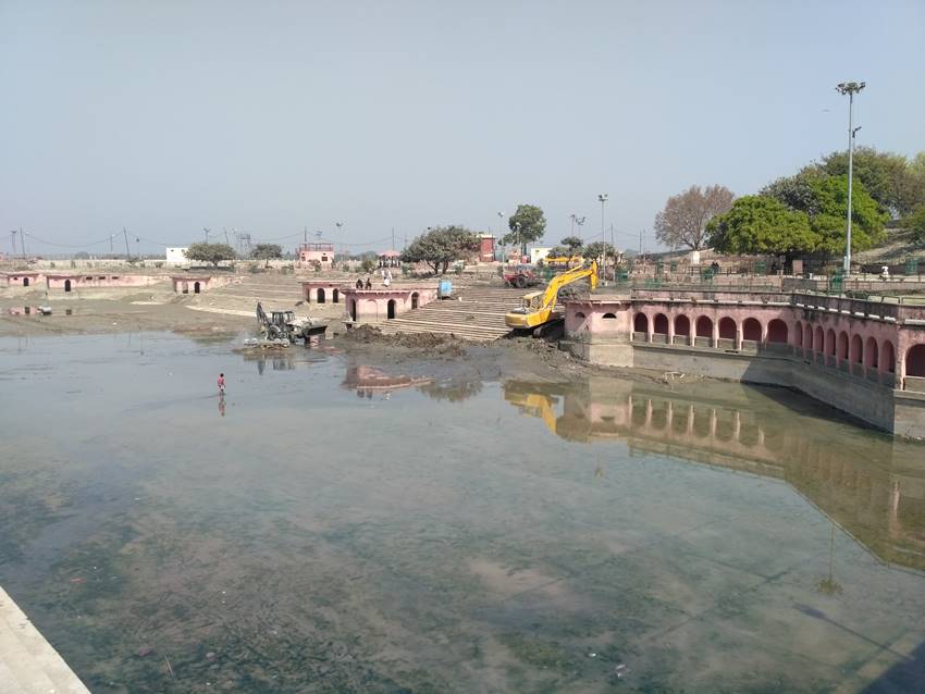 वहां की राम पौढ़ी की सफाई का काम तो चल रहा है। यह पहले से ही हो रहा है। लगा नमामि गंगे का धन खर्च हो रहा है। सरयू नदी का पानी इस ‘स्वर्ग का रास्ता’ कहे जाने वाले राम पौढ़ी होकर ही गुजर कर वापस सरयू में मिल जाता है। जेसीबी मशीन से जमा कीचड़ निकालने का काम जोर-शोर से जारी है।