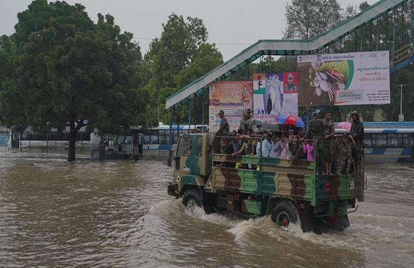 गुजरात के कई हिस्सों में इन दिनों भारी बारिश के कहर से जनजीवन अस्त व्यस्त हो गया है। वडोदरा शहर में तो बारिश के बाद बाढ़ जैसे हालात पैदा हो गए हैं। कई इलाके तो समंदर में तब्दील हो चुके हैं। इस बीच पुलिस उप-निरीक्षक गोविंद चावड़ा द्वारा देवीपुरा इलाके में एक बच्ची को बारिश के पानी के पानी से बचाने की काफी तारीफ हो रही है। बताया जा रहा है कि अब तक हजारों लोगों का रेस्क्यू किया जा चुका है। मौके पर सेना, एनडीआरएफ, एसडीएआरएफ मौजूद है। शहर में बारिश संबंधी घटनाओं में करीब 5 लोगों की मौत हो चुकी है। इस दौरान रिहायशी इलाकों में मगरमच्छ घुसने की खबर भी है।