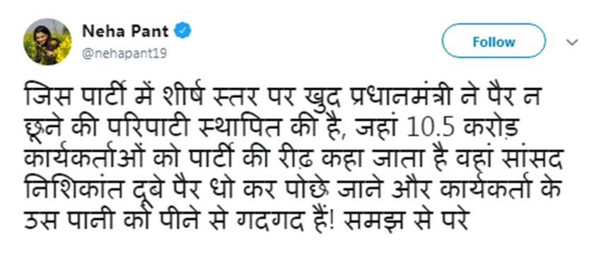 दरअसल, झारखंड के गोड्डा स्थित कनभारा इलाके में रविवार (16 सितंबर) को पुल का शिलान्यास करने सांसद पहुंचे थे। कार्यक्रम में मंच वह उनके साथ पार्टी कार्यकर्ता पवन साह भी थे। उन्होंने उसी दौरान दुबे के पैर धोए और उसी गंदे पानी को बाद में पिया। सांसद ने इस पूरे घटनाक्रम से जुड़ा एक फोटो सोशल मीडिया पर शेयर किया, जिसके बाद विवाद पनप गया।