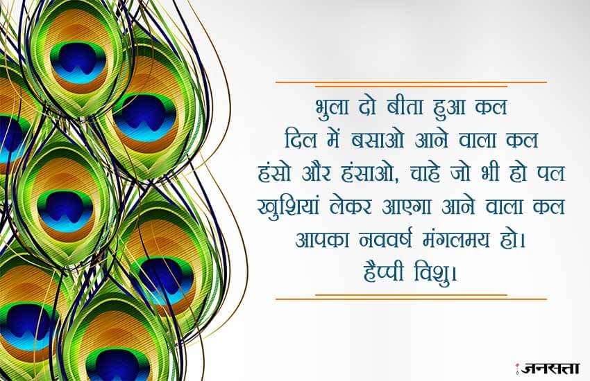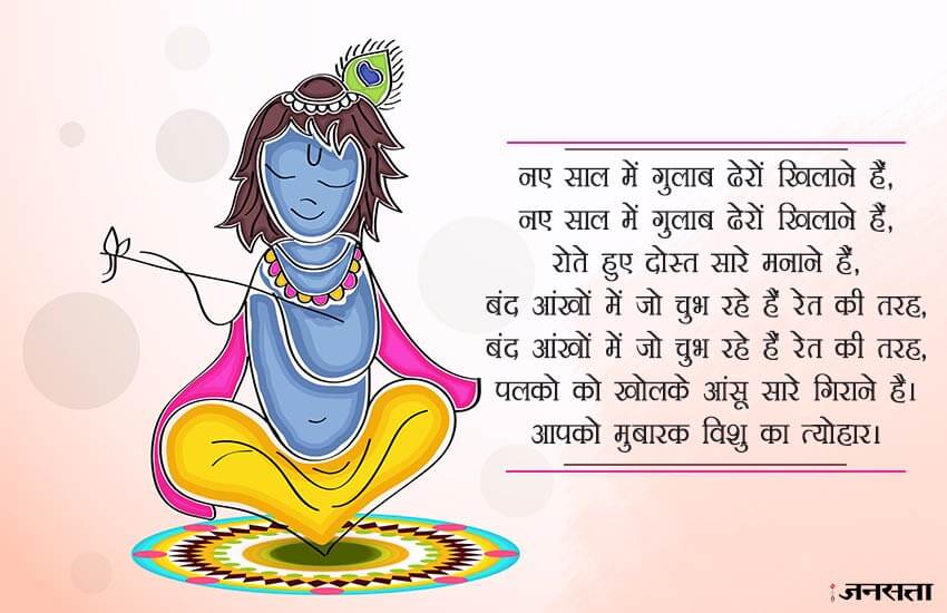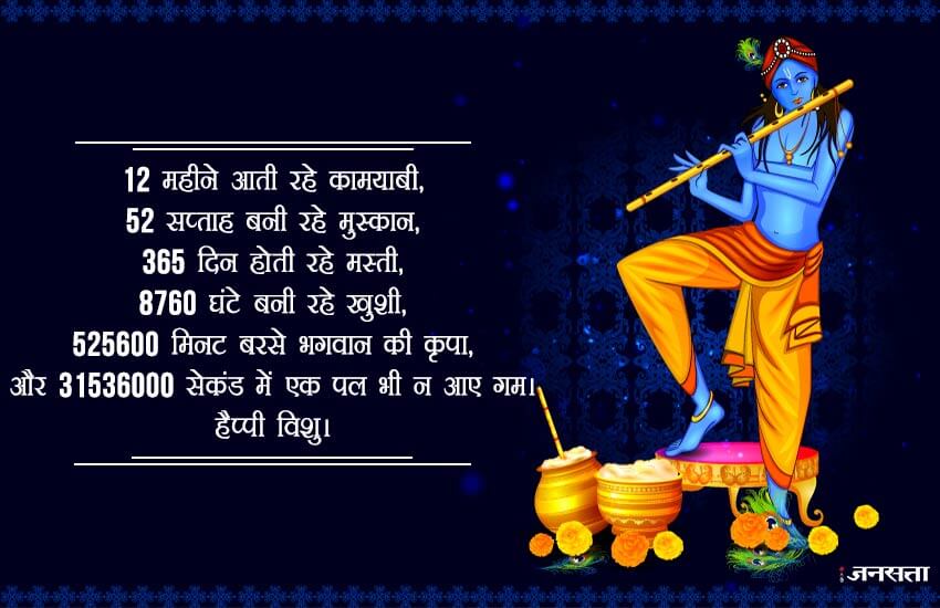 मान्यता है कि इस समय सूर्य बिलकुल सीधा पूर्व से विष्णु(विशु) पर पड़ता है। इस समय भगवान विष्णु और उनके अवतार भगवान श्री कृष्ण की पूजा की जाती है। भगवान विष्णु को समय का ईश्वर माना जाता है और चूंकि विष्णु खगोलीय वर्ष के पहले दिन को चिह्नित करता है जिस कारण लोग भगवान विष्णु की पूजा करते हैं। इस दिन के बारे में कहा जाता है कि श्रीकृष्ण ने नरकासुरा को मारा था। यह एक कारण है कि माता- पिता अपने बच्चों को कृष्ण की तरह कपड़े पहनाते है और घरों में श्री कृष्ण की मूर्तियों को रखते हैं। लोग इस दिन को याद करने और अपने करीबियों को शुभकामनाएं देने के लिए सोशल मीडिया का इस्तेमाल कर रहे हैं। आप भी इन वॉलपेपर, स्टेटस और फोटोज के जरिए अपने रिश्तेदारों और दोस्तों को खास तरीके से शुभकामनाएं दें सकते हैं।