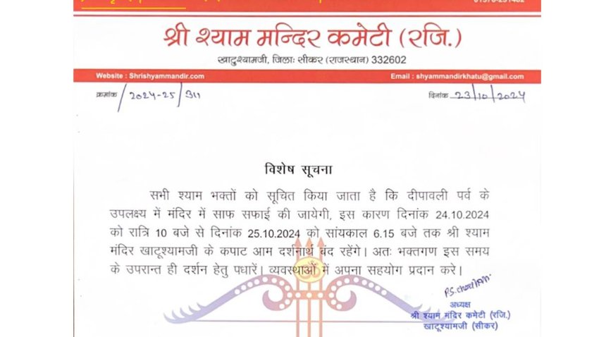 श्री श्याम मंदिर कमेटी से सूचना देते हुए कहा कि सभी श्याम भक्तों को सूचित किया जाता है कि दीपावली पर्व के उपलक्ष्य में मंदिर में साफ सफाई की जाएगी। इस कारण 24 अक्टूबर की रात 10 बजे से 25 अक्टूबर को शाम 6 बजकर 15 मिनट तक श्री श्याम मंदिर खाटू श्याम जी के कपाट आम दर्शनार्थ बंद रहेंगे। इसलिए भक्तगण इस समय के उपरांत ही दर्शन हेतु पधारें। व्यवस्थाओं में अपना सहयोग प्रदान करें।