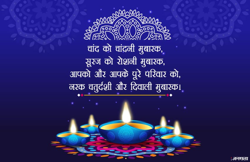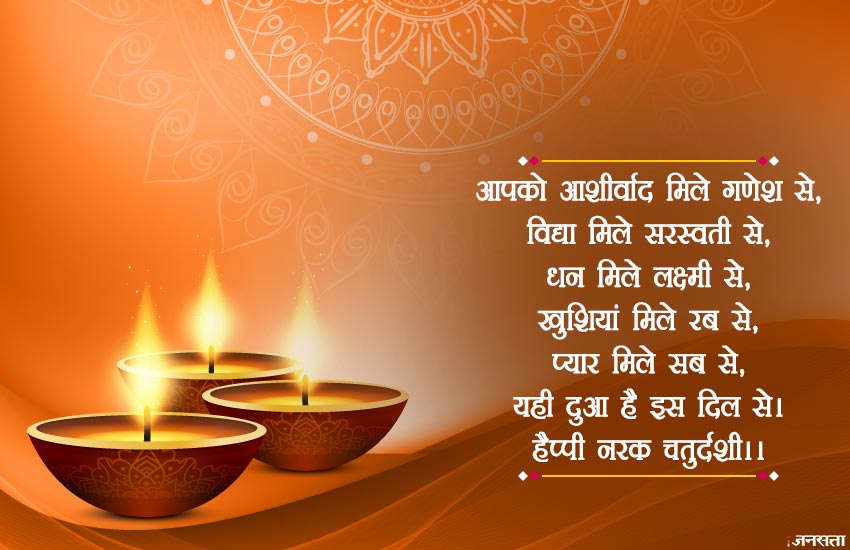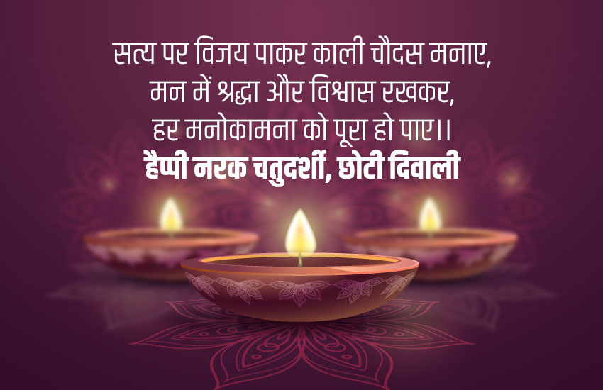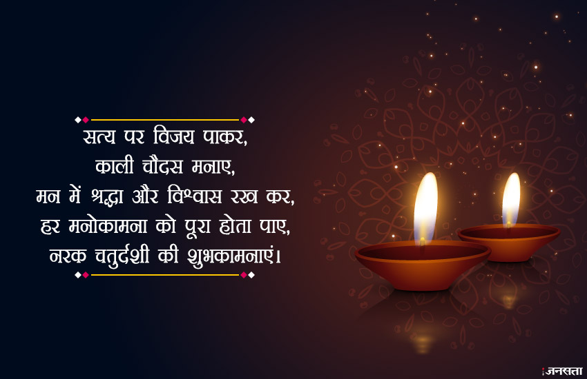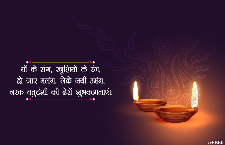 माना जाता है कि नरकचतुर्दशी के दिन पूजा करने वाले को नरक से मुक्ति मिलती है। इस दिन आलस्य और बुराई को हटाकर जिंदगी में सच्चाई की रोशनी का आगमन होता है। नरक चतुर्दशी के दिन लोग सूर्योदय से पहले उठकर, शरीर पर तेल लगाकर और पानी में चिरचिरी के पत्ते डालकर उससे स्नान करते हैं। इस दिन घर की सजावट और रंगीन रंगोली बनाकर मानते हैं और करीबियों को शुभकामनाएं देते हैं। आप भी इन खास मैसेजेज, एसएमएस और कोट्स के जरिए अपने दोस्तों को शुभ संदेश भेज सकते हैं।